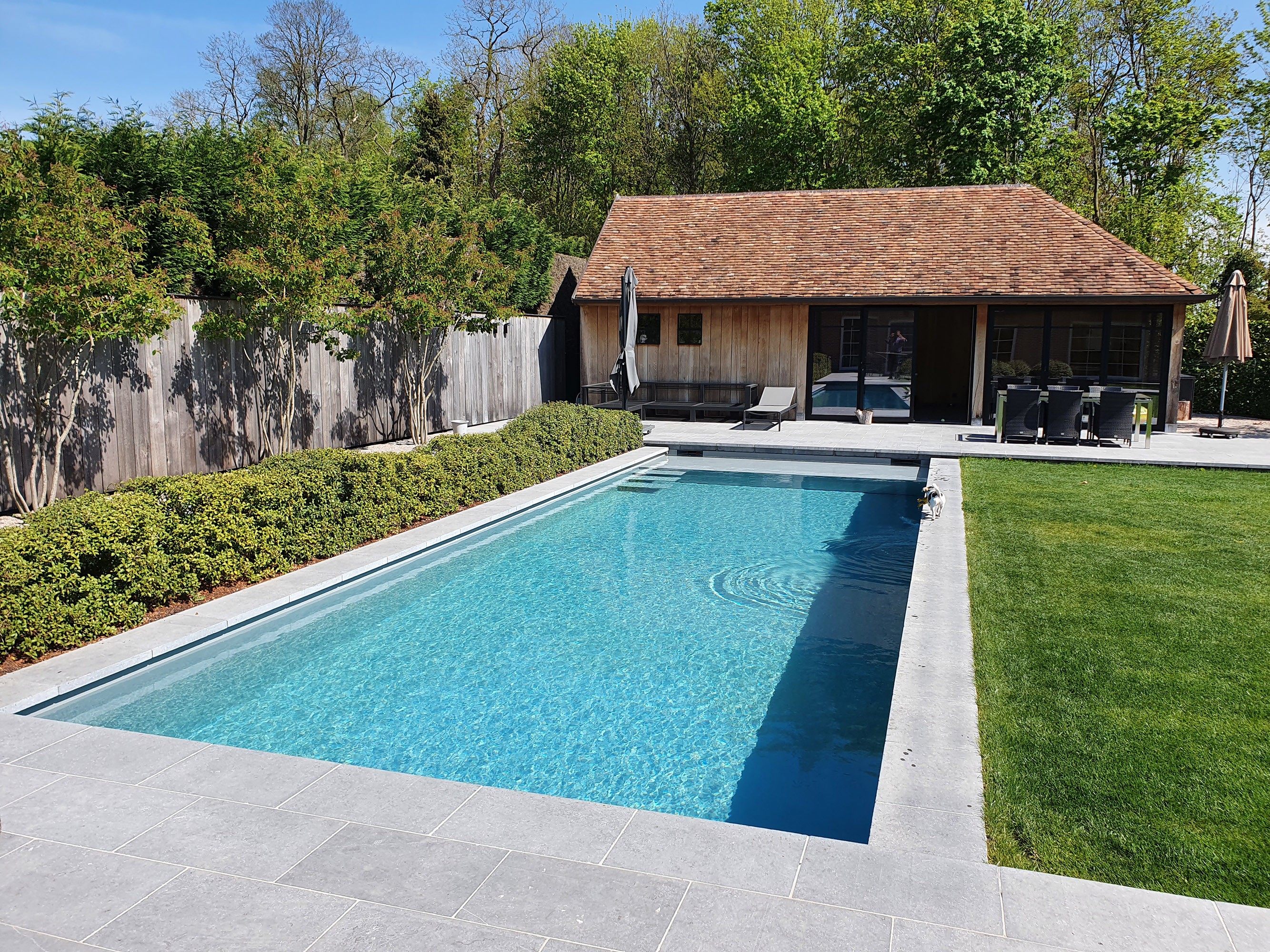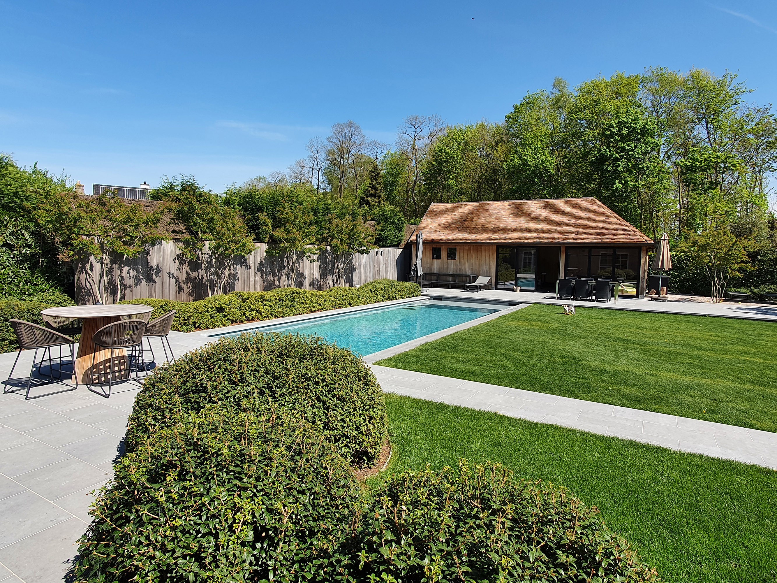 Cette piscine signée H2O-Construct offre tout le luxe et la facilité dont vous avez besoin pour une expérience de baignade relaxante. L'eau est limpide et est maintenue à un niveau élevé par les skimmers. Les margelles de la piscine ont été réalisées dans une magnifique pierre bleue belge, conférant à l'ensemble une allure élégante qui colle parfaitement à l’ambiance méridionale du jardin. Des chaises longues et du mobilier d'extérieur de qualité haut de gamme ont également été ajoutés pour offrir davantage de confort et de style. Pour compléter le tableau, tout a été soigné jusque dans les moindres détails.