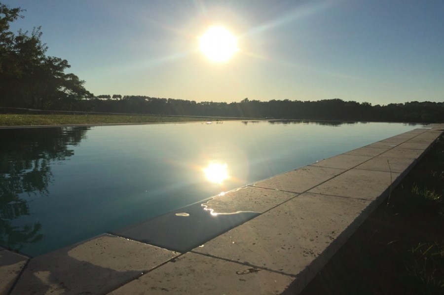 Absolument écologique mais tout de même moderne, cette piscine est tout cela à la fois. En raison de sa ligne d’eau haute, elle arbore les mêmes qualités esthétiques qu'une piscine à débordement, mais est beaucoup moins énergivore. Avec ce look de piscine à débordement, elle se marie à merveille avec les dernières tendances en matière de design et, grâce à son bassin gris clair, l’eau arbore une couleur très bleue.
