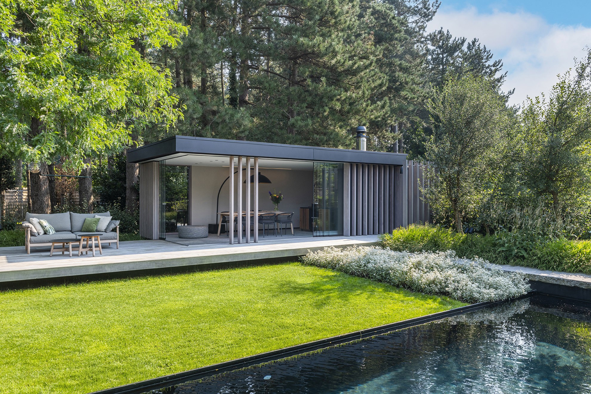 Puur a remporté, l'an dernier, le prix d'or dans la catégorie « Étangs de natation hybrides - 2023 » grâce à l'étang de natation de ce jardin. Cette année, le pool house qui l'accompagne est également récompensé et, à juste titre : un prix d'or pour un projet réalisé à la perfection.