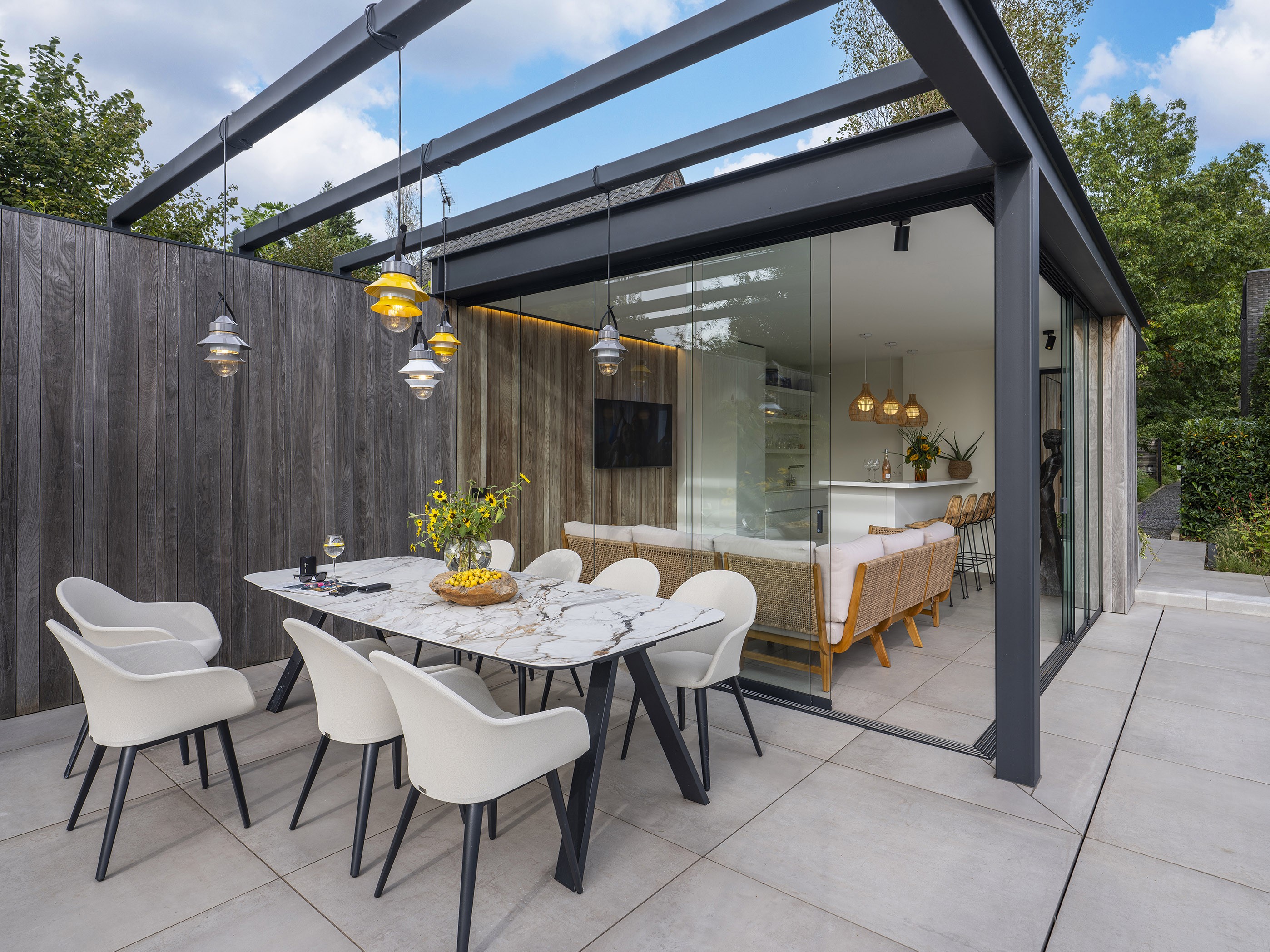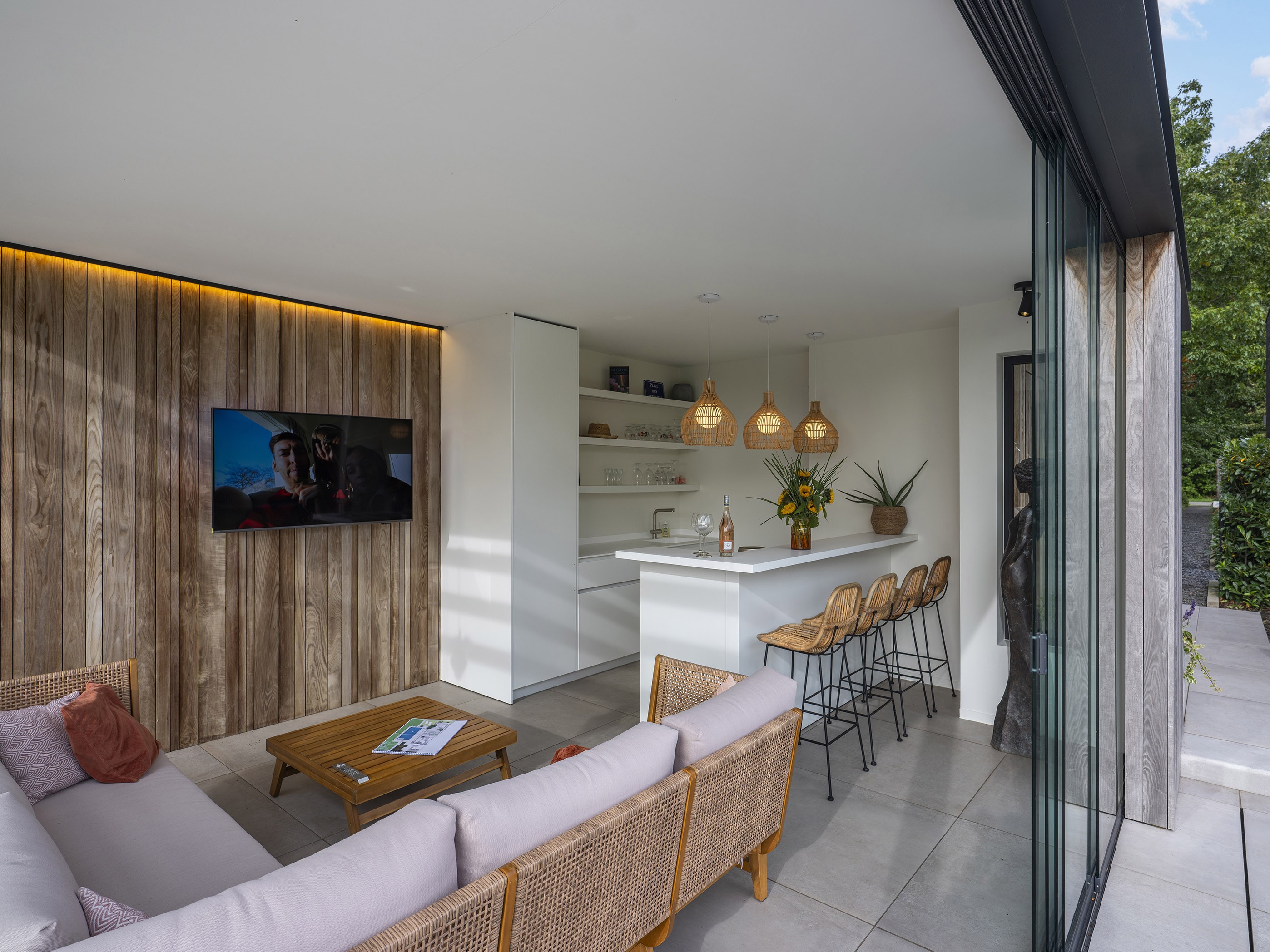 Étudier, regarder la télévision, jouer, faire des crêpes, prendre un verre... Y a-t-il quelque chose que ce pool house avec cuisine intégrée ne peut pas offrir ? Ce pool house a été conçu par l'architecte de jardin Roeland Vranckx et réalisé par Carpentier Hardwood Solutions. Le résultat est une dépendance polyvalente qui est fréquemment utilisée par les enfants pour se baigner pendant la journée. La nuit, lorsque les enfants dorment, il devient un endroit agréable pour les parents qui peuvent se détendre dans le confort de ce bâtiment.