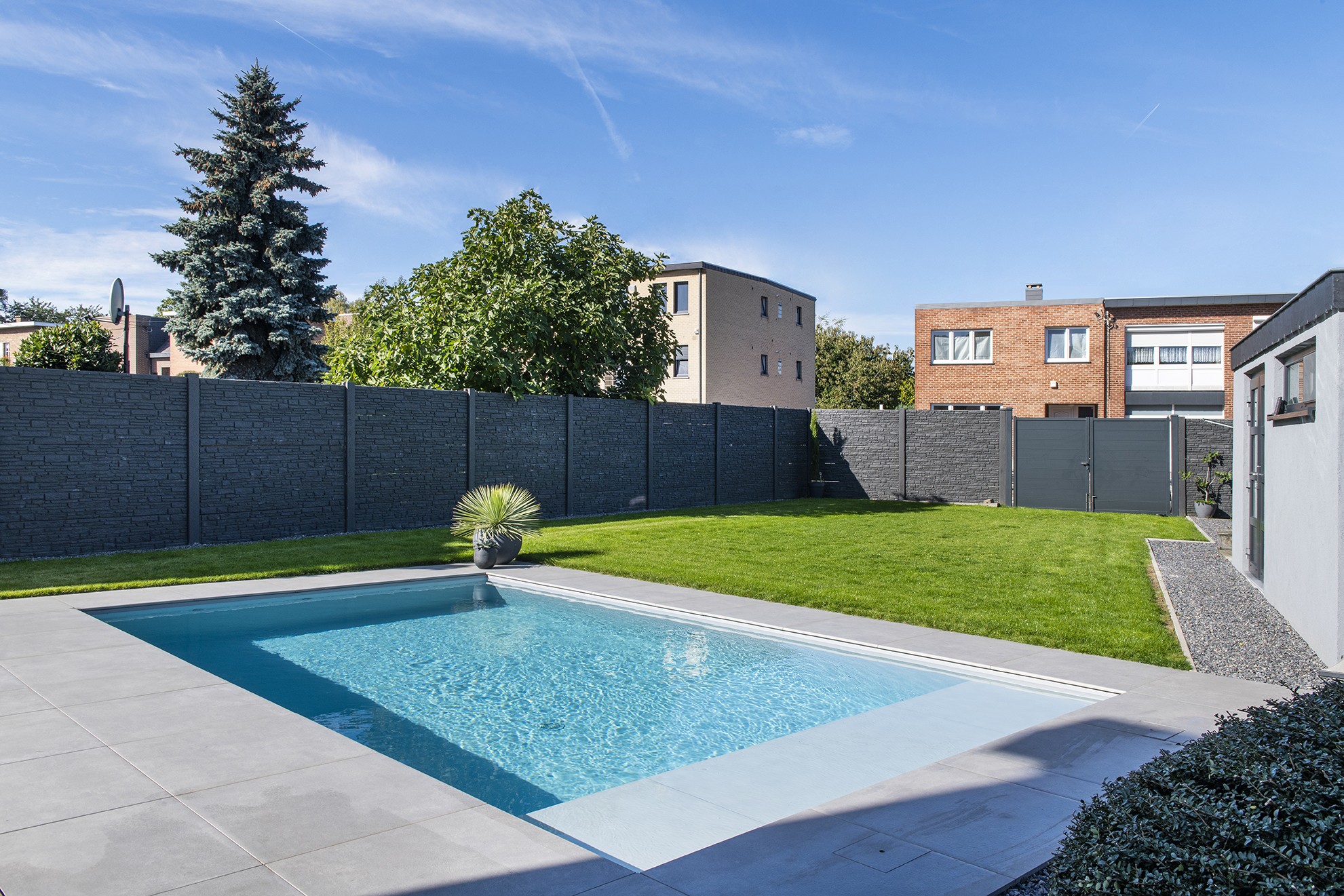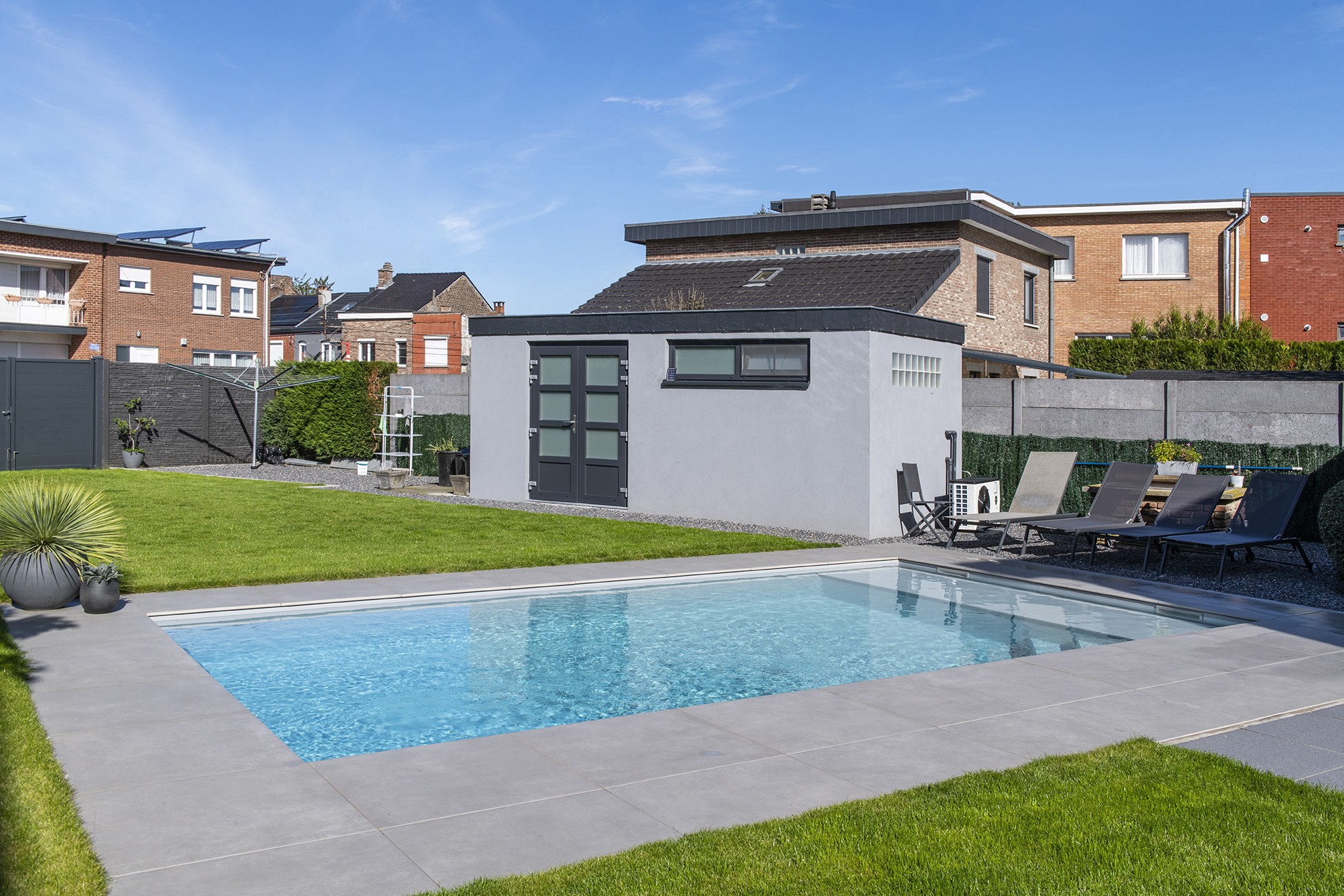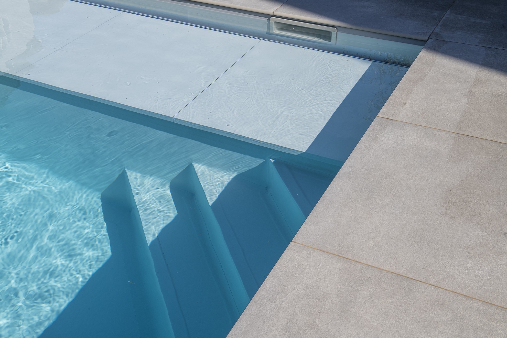 Leconstructeur de la piscine score également avec l’installation technique et les couvertures de skimmer soigneusement dissimulées.