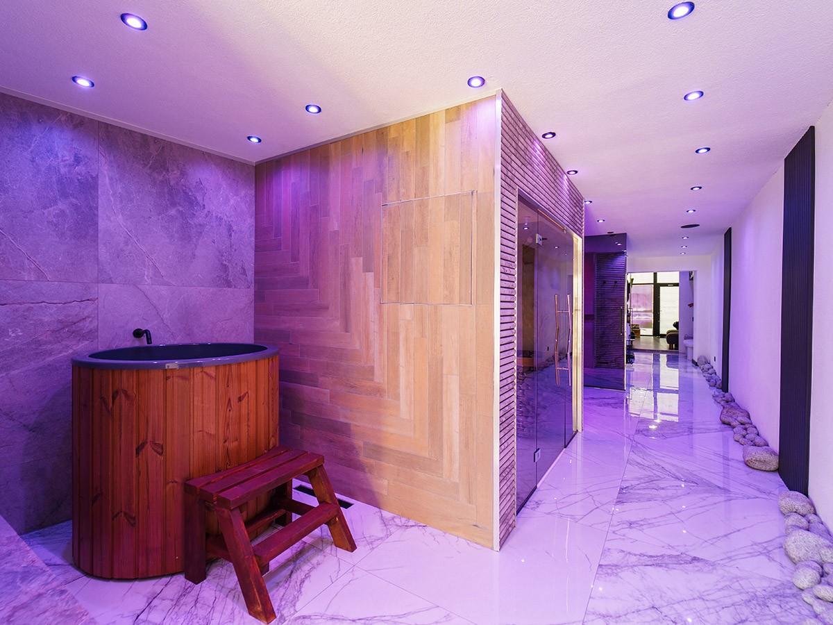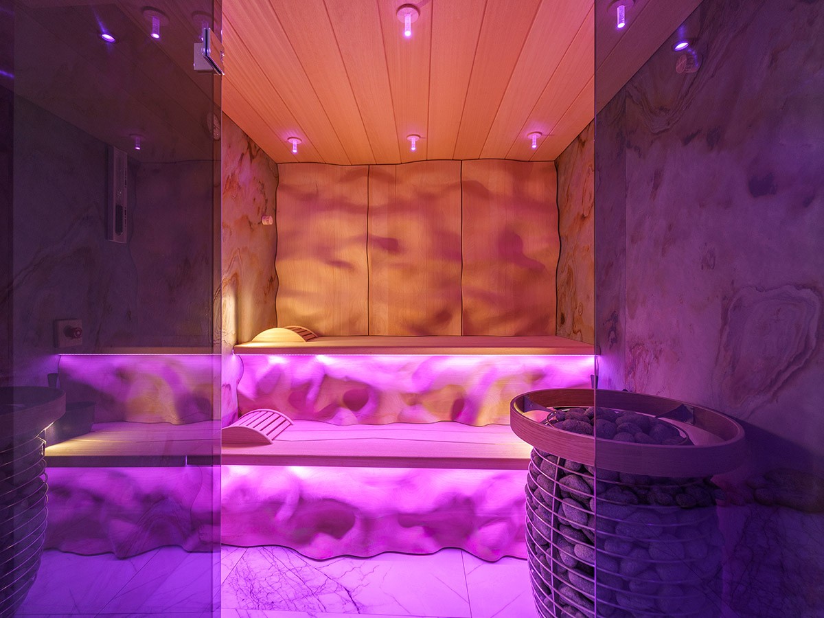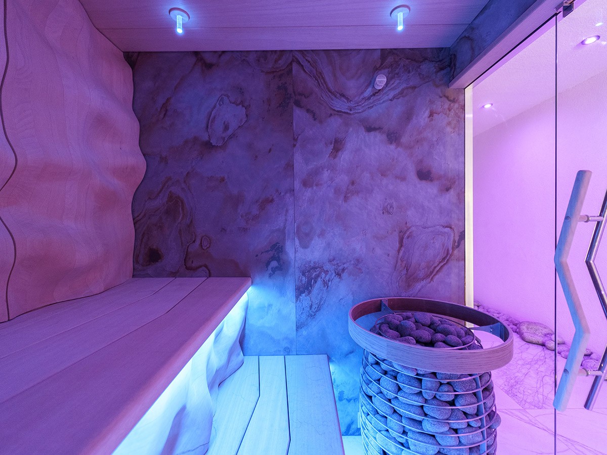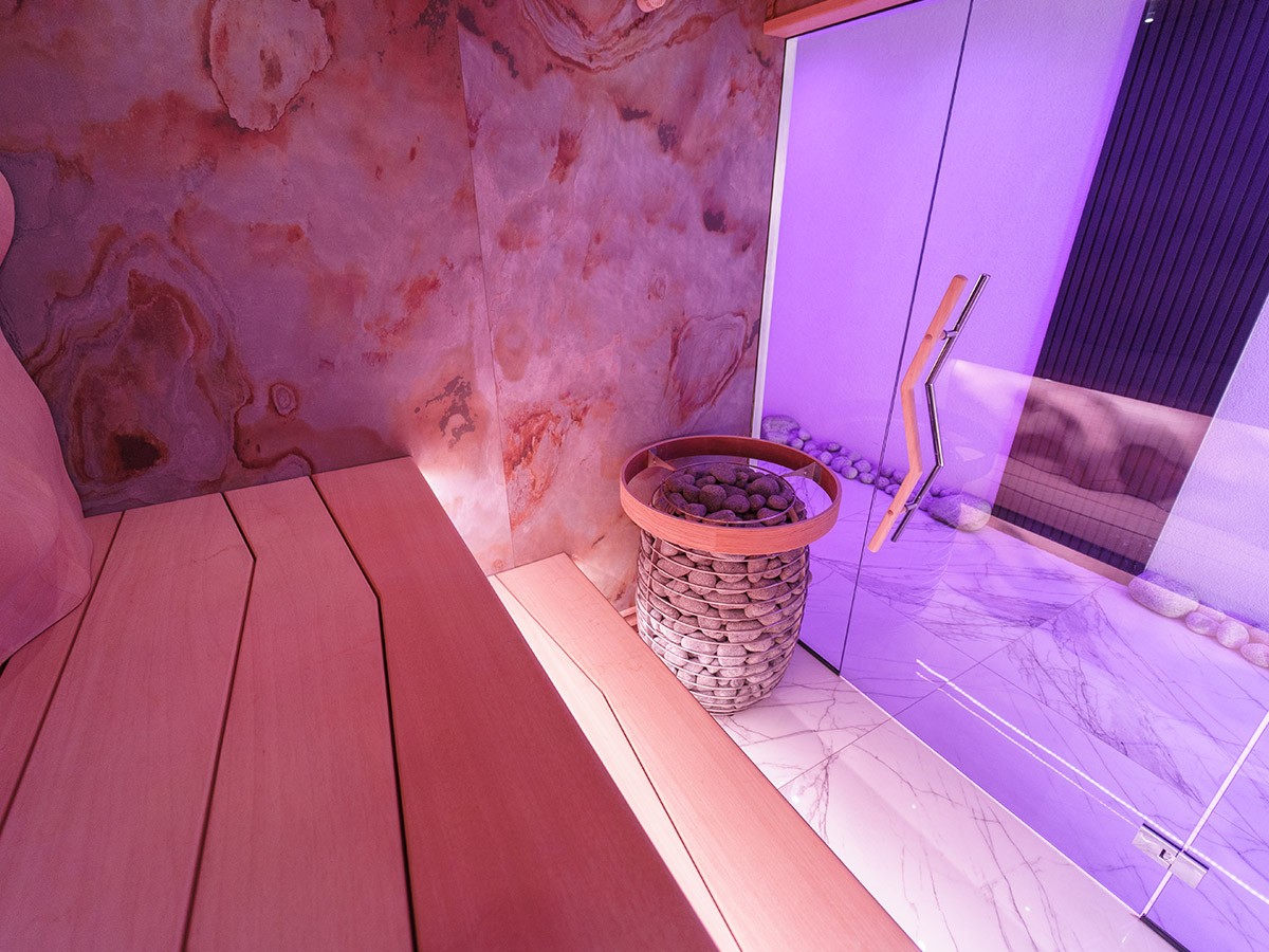Ce sauna privé, également utilisé à des fins de location, a été conçu comme un véritable chef-d’oeuvre de design et de savoir-faire. La finition intérieure associe du bois de cèdre moulé en 3D aux parois en placage de pierre, spécialement développées pour une utilisation dans les saunas. La façade vitrée avec poignée en inox et le puissant poêle HUUM HIVE de 15 kW doté de 250 kg de pierres permettent de longues séances de vapeur. Le subtil éclairage RGB souligne les lignes ondulées et crée une expérience de bien-être moderne et pleine d’ambiance. Un sauna qui allie esthétique pure et fonctionnalité.